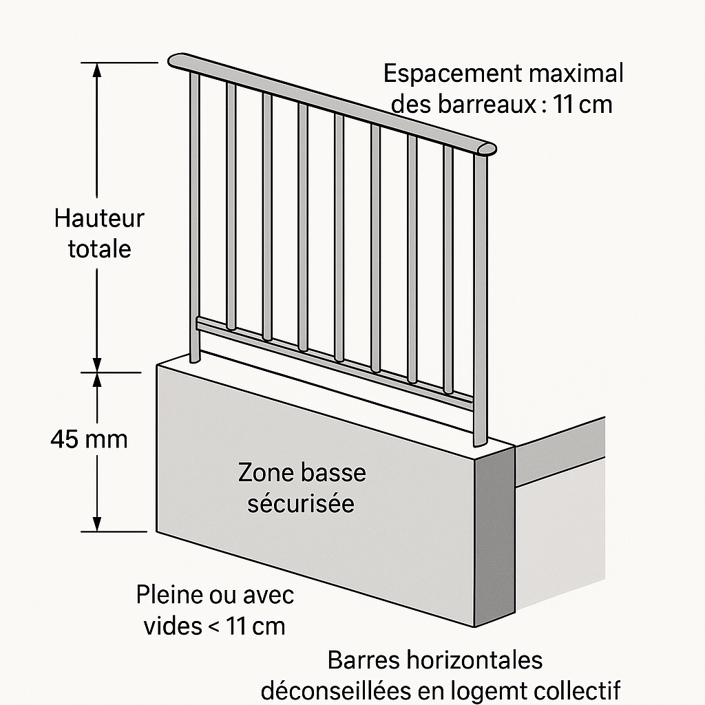 Déconseillé de mettre des barres horizontales pouvant être escaladées, surtout en logement collectif.